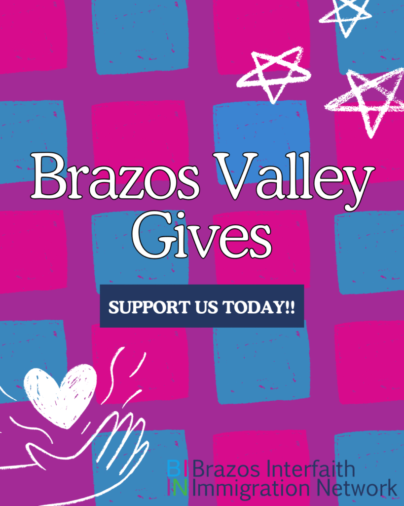 Please consider supporting the Brazos Interfaith Immigration Network through Brazos Valley Gives today! Your donation directly supports our mission to promote the human dignity and well-being of all immigrants accessing legal, educational and social services. To donate visit: https://www.brazosvalleygives.org/organization/brazosimmigration